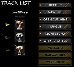 Choose from several tracks, with destructible environments such as: shopping centres, national geological treasure caves, farmlands, mining sites, jungle and dirt roads, multiple railway crossings, china shops, active volcanoes, a wizard battle with dragons, and even an Amazoom warehouse.